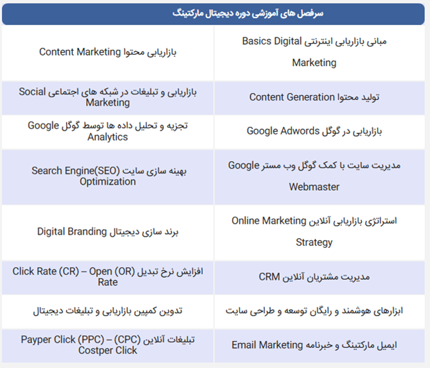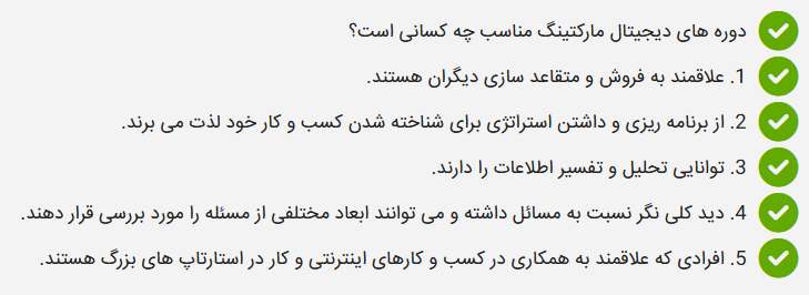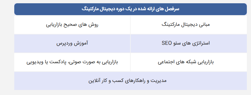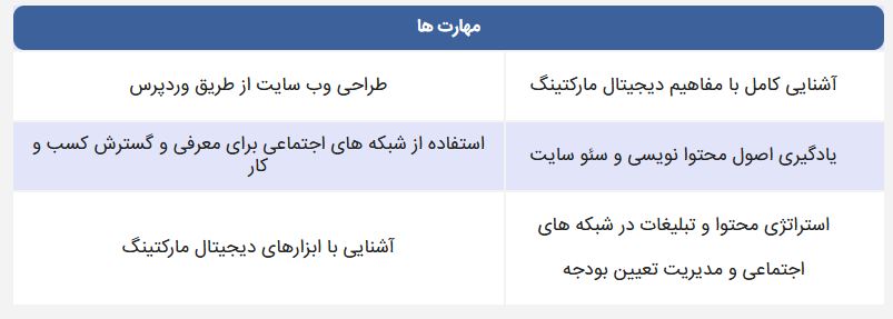 امروزه موسسات مختلفی اقدام به برگزاری دوره دیجیتال مارکتینگ می کنند. هر فرد پس از پایان دوره های آموزشی مثل دوره های آموزشی سازمان فنی و حرفه ای کشور و… مدرک پایان دوره و گواهی مهارت را از موسسه آموزشی دریافت می کند. این مدارک معتبر و قابل ترجمه هستند و می توان از آن به عنوان رزومه کاری و مهارتی برای استخدام در شرکت ها و استارتاپ های داخلی و بین المللی استفاده کرد.